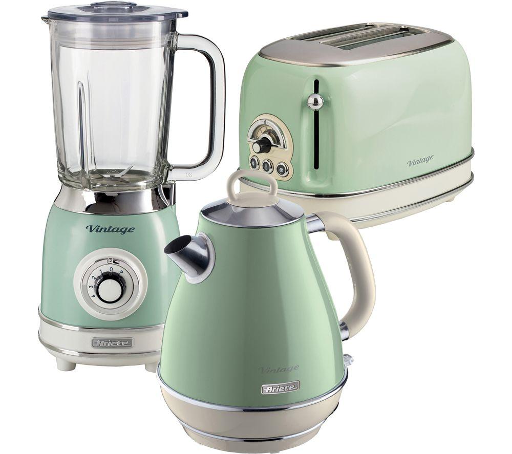 Get everything you need. This Ariete bundle includes a 2-slice toaster, a kettle and a blender in the same retro design so you can add a touch of vintage style to your kitchen.___________________________________________________________________________Ariete Vintage 155 2-Slice Toaster - Green- 6 browning levels let you decide how crunchy you want your toast- You can easily defrost frozen bread or reheat cold slices- With a removable crumb tray, it's easy to keep your worktop clean and tidy___________________________________________________________________________ARIETE Vintage 2869 Jug Kettle - Green- Prepare hot drinks for your whole family with the 1.7-litre capacity- The 360° base makes the kettle easy to use whether you're left- or right-handed- The removable filter keeps limescale out of your drinks, so you can enjoy better-tasting tea and coffee- Safety features like the cool-touch housing and auto switch-off will give you extra peace of mind___________________________________________________________________________Ariete Vintage 583 Blender - Green- Choose between 4 speed settings and a pulse function to blend fruit and veg, and even crush ice- With the 1.5-litre glass jug, you can make refreshing cocktails or creamy milkshakes for your whole family- The non-slip feet keep everything steady while you're blending