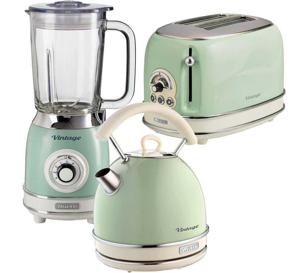 Get everything you need. This Ariete bundle includes a 2-slice toaster, a kettle and a blender in the same retro design so you can add a touch of vintage style to your kitchen.___________________________________________________________________________Ariete Vintage 155 2-Slice Toaster - Green- 6 browning levels let you decide how crunchy you want your toast- You can easily defrost frozen bread or reheat cold slices- With a removable crumb tray, it's easy to keep your worktop clean and tidy___________________________________________________________________________Ariete Vintage 2877 Traditional Kettle - Green- Prepare hot drinks for your whole family with the 1.7-litre capacity- The 360° base makes the kettle perfect for left- or right-handed use- There's also a removable limescale filter, so you can enjoy better-tasting tea and coffee___________________________________________________________________________Ariete Vintage 583 Blender - Green- Choose between 4 speed settings and a pulse function to blend fruit and veg, and even crush ice- With the 1.5-litre glass jug, you can make refreshing cocktails or creamy milkshakes for your whole family- The non-slip feet keep everything steady while you're blending