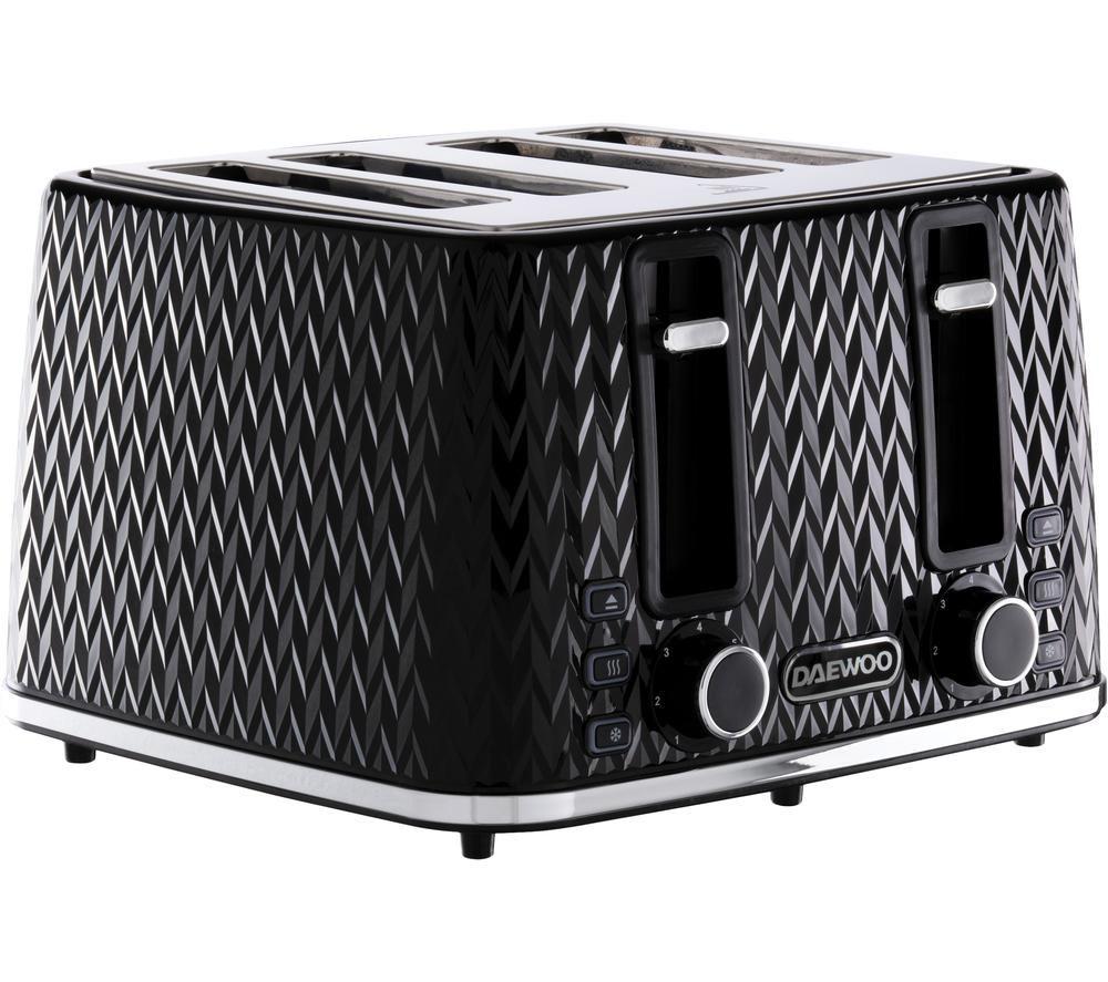 The Daewoo Argyle Collection SDA1863 4-Slice Toaster will save you the ordeal of preparing the breakfast for your family. Insert up to 4 slices at a time and get perfect toasts your family will love.The dial control lets you adjust the browning level to suit your taste. Thanks to intuitive operation you can easily use functions such as defrost, reheat or cancel. What's more, the SDA1863 offers dual control for each of two pairs of slots, so you can prepare two sets of toast at different browning level.The practical crumb tray can be removed, so it's easier to keep your toaster clean.