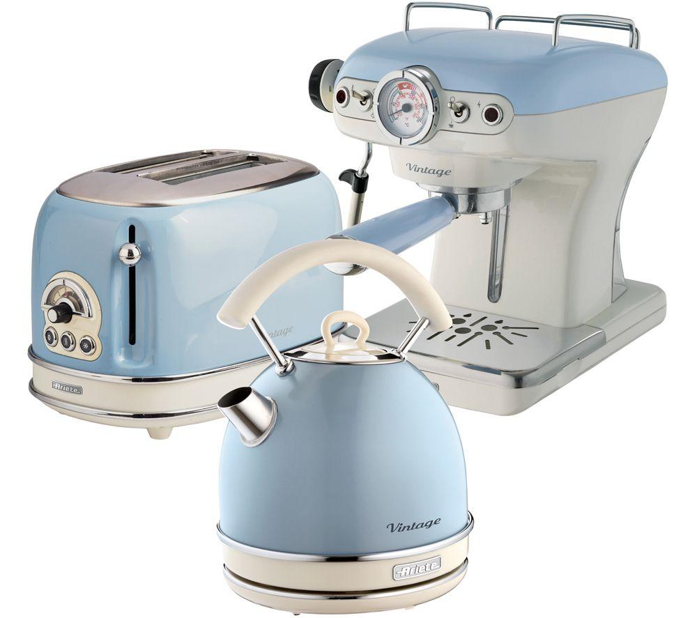 You're all set for breakfast with this Ariete bundle. It includes a matching 2-slice toaster, kettle and espresso coffee maker, so you can add a touch of vintage style to your kitchen.___________________________________________________________________________Ariete Vintage 155 2-Slice Toaster - Blue- 6 browning levels let you decide how crunchy you want your toast- You can easily defrost frozen bread or reheat a cold slice- With the removable crumb tray, it's easy to keep your worktop clean___________________________________________________________________________Ariete Vintage 2877 Traditional Kettle - Blue- Prepare hot drinks for your whole family with the 1.7-litre capacity- The 360° base makes the kettle perfect for left- or right-handed use- There's also a removable limescale filter, so you can enjoy better-tasting tea and coffee___________________________________________________________________________Ariete Vintage Espresso 1389 Coffee Machine - Blue- It works with ground coffee or ESE pods, so you can enjoy an authentic espresso any time without the hassle of grinding beans- The 15-bar pump gives you just the right amount of pressure for perfect extraction and a rich crema- A steam wand lets you create delicious milk foam for barista-quality macchiatos and cappuccinos- It comes with 1-cup and 2-cup filters, so you can easily make coffee for a friend- A removable drip tray helps keep the machine and your worktop clean