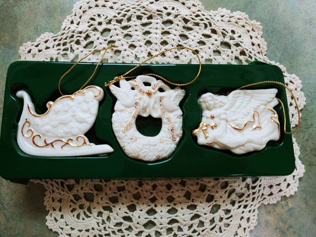 Avon Bisque Porcelain Christmas Ornament Trio Set in Original Box, 24K Gold Accents
