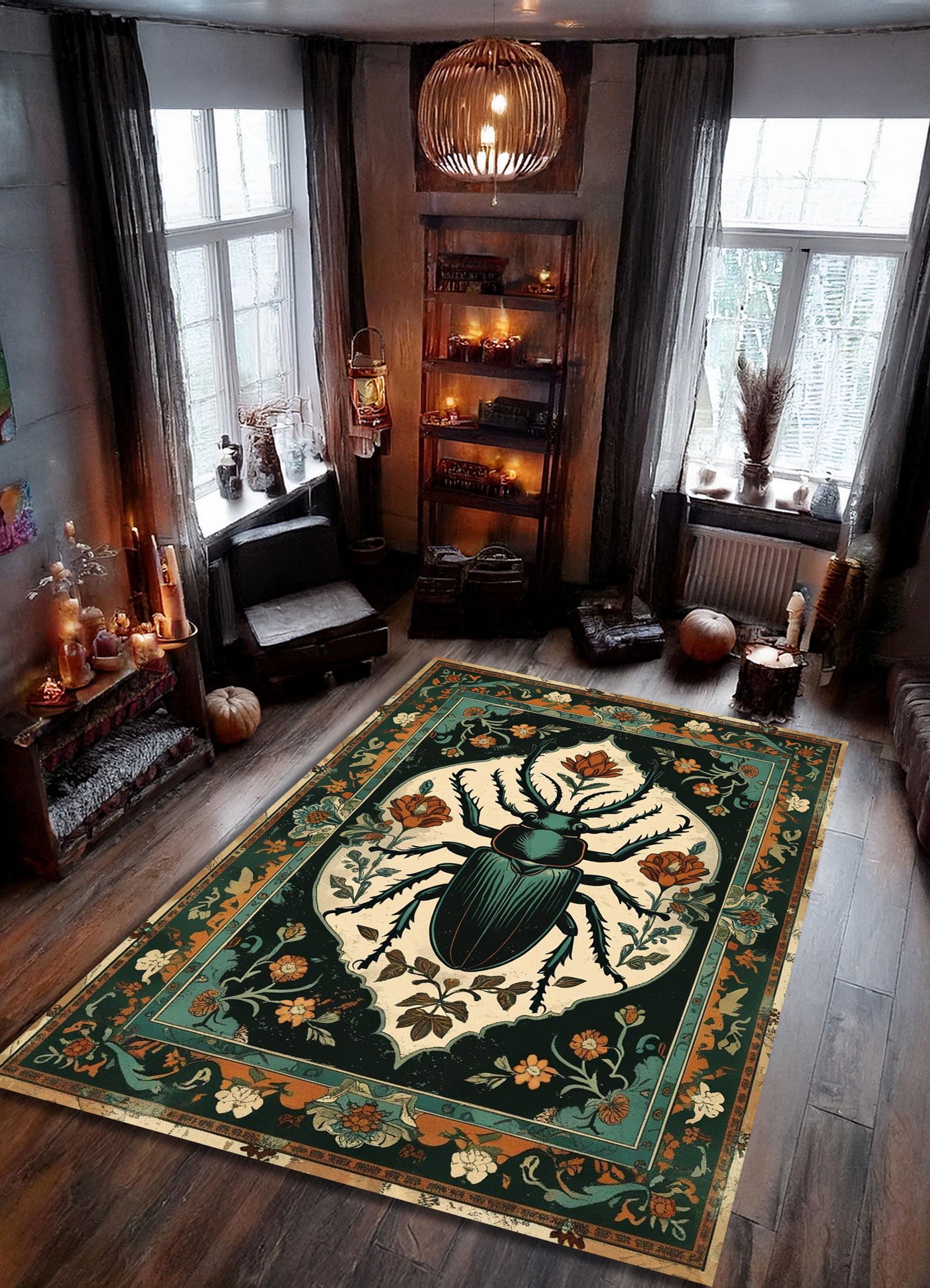 Vintage Stag Beetle Rug, Botanical Pattern Rug, Boho Persian Style Bug Rug, Rustic Beetle Area Rug, Mothcore Home Decor, Insect Rug