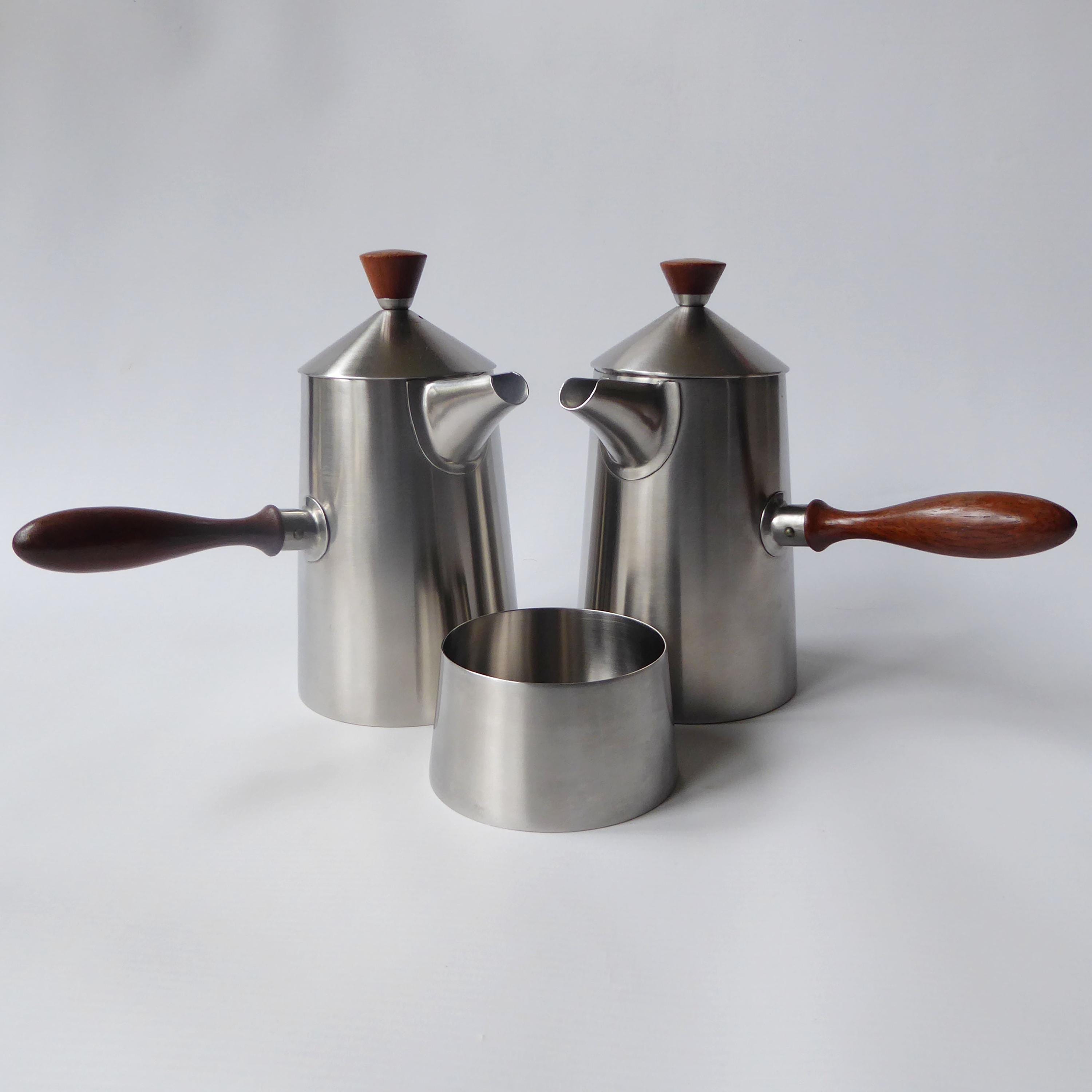 Rare early Old Hall Robert Welch Campden coffee set. Hot water/milk jug pots + sugar bowl. 1950s stainless steel + teak. Modernist vintage