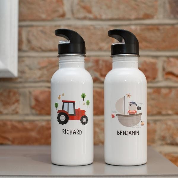 Personalised Kids Water Bottle, Aluminium Tractor or Hippo Pirate Design