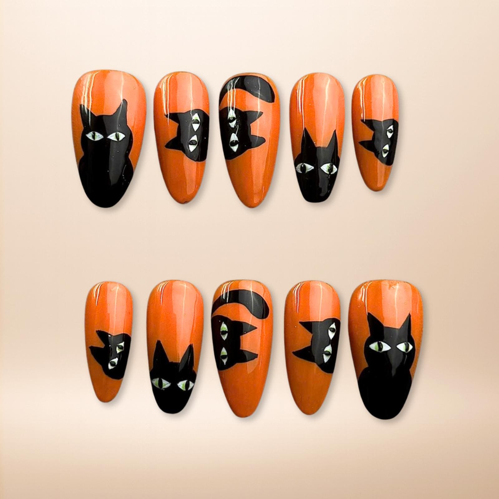 Handmade Halloween Press On Nails, Black Cat Silhouette, Orange Base