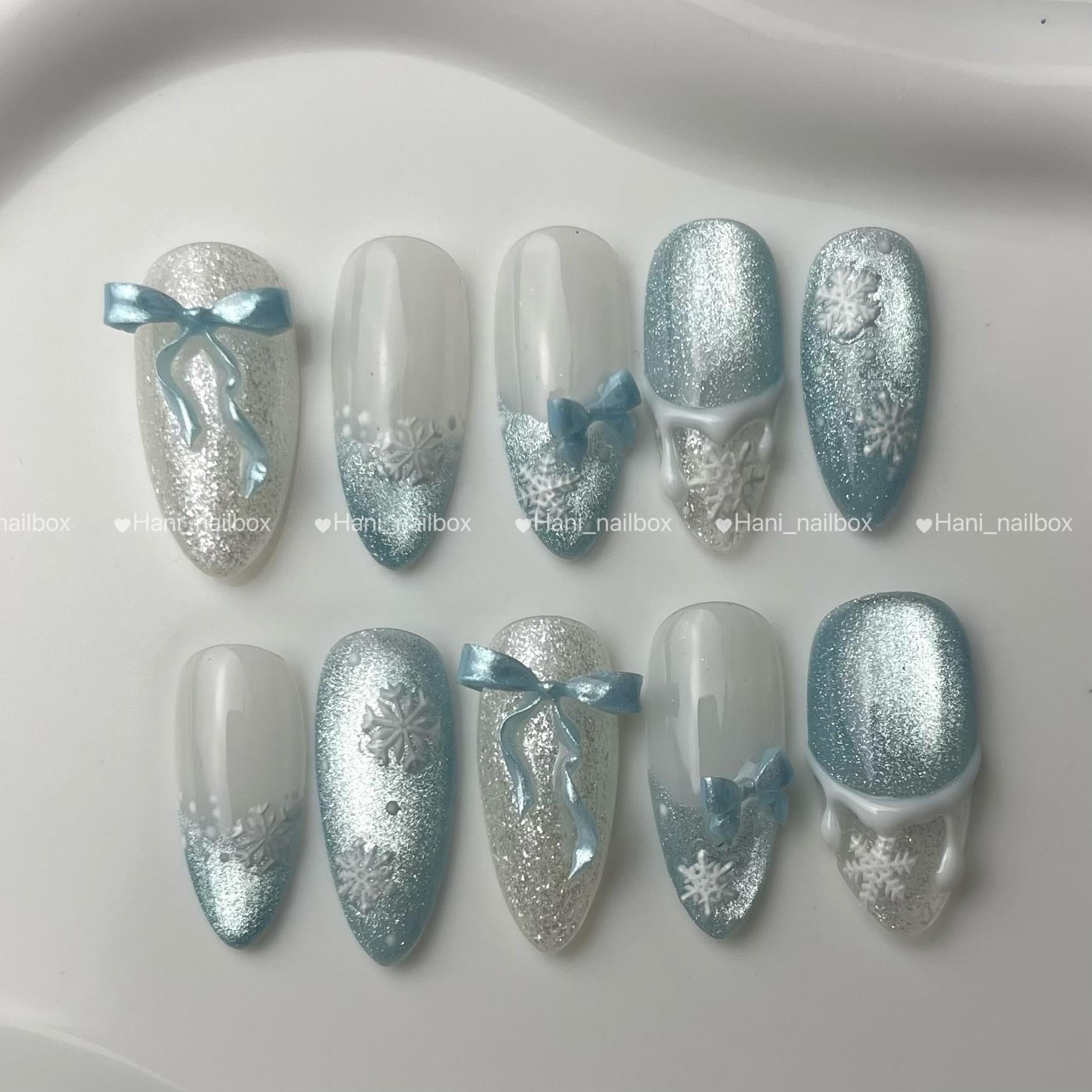 Elegant Blue Cat Eye Nails with Snow Dust & Crystal Bows