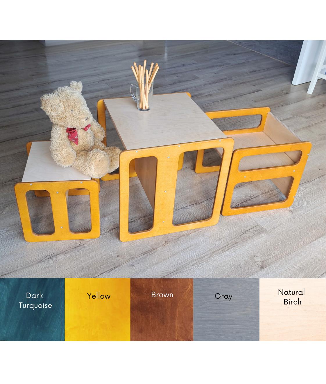 Kids chair and table, Montessori chair set, Gray cube chair, Weaning table and chair, Adjustable chair and table, Kids table, Wooden chair