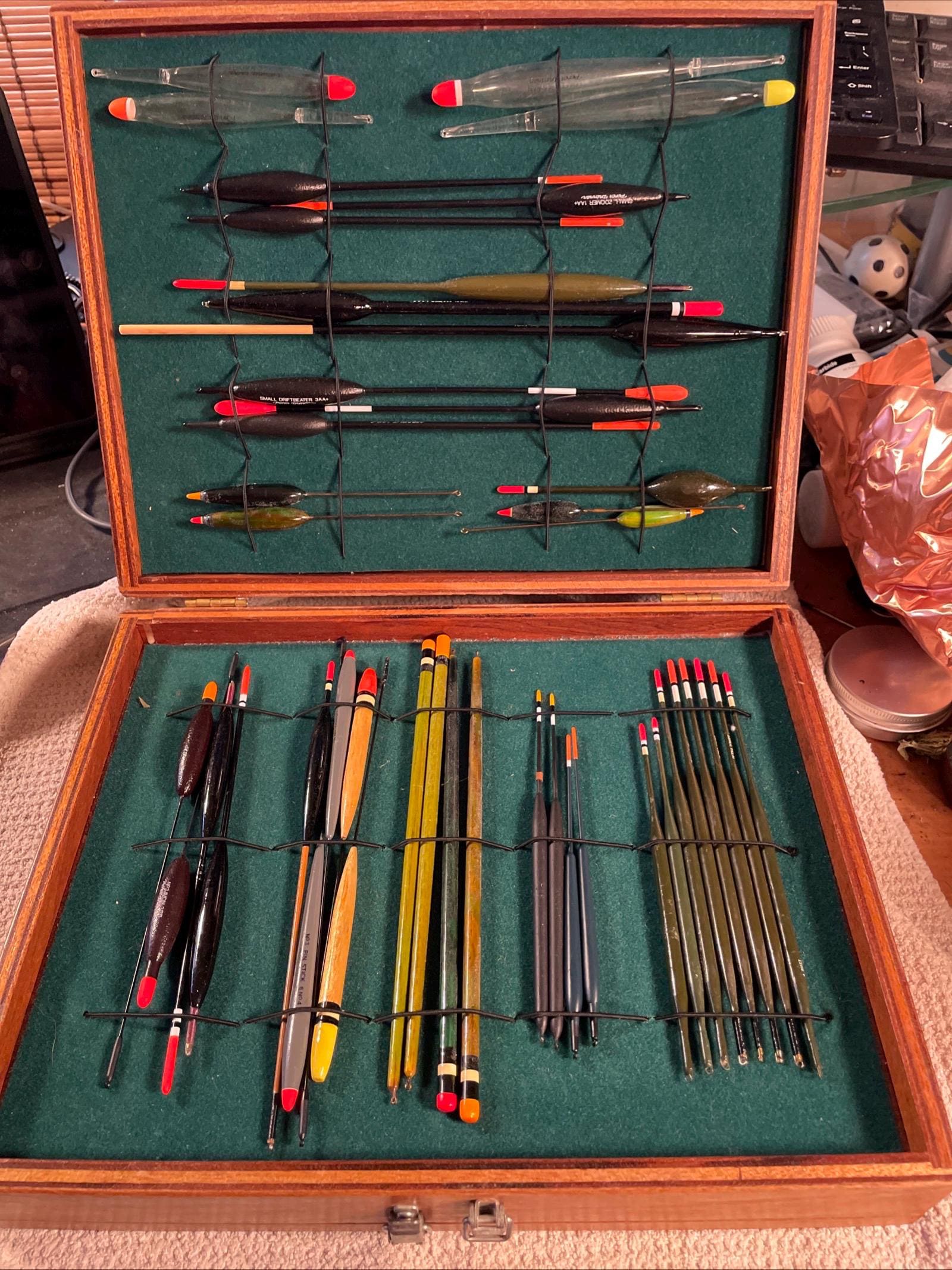 Vintage English Fishing Floats in 2 Tier Box Ivan Marks, Benny Ashurst, Drennan