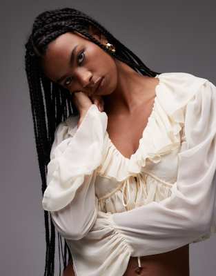 ASOS DESIGN chiffon ruffle tie front blouse in ecru-White